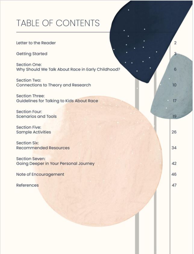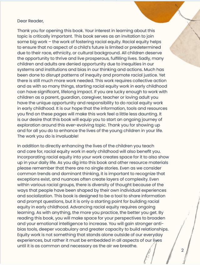 The book, Talking to Kids About Race: An Introductory Guide to Building Foundations for Racial Equity in Early Childhood, is a must-read for parents, caregivers, early childhood educators and anyone who interacts with young children. This book (TTKAR) not only explains why it is important to build foundations for racial equity in early childhood, but it also tells readers how to begin. The concept of race can be difficult for young children to understand. Still, research shows that talking to kids about race at an early age contributes positively to their identity development and their ability to establish anti-bias perspectives. The mix of developmental theory, practical tools, and experiential activities included in TTKAR will leave the reader feeling equipped to begin facilitating conversations with children that demystify race and promote inclusive mindsets. Piper Adonya’s engaging illustrations bring the content to life and display a beautiful diversity of skin tones and physical features.